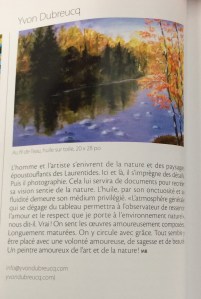 « Nous avons trouvé un parfait équilibre dans notre vie quotidienne et en parcourant notre belle région en tant qu’artistes peintres. Une grande complicité est née entre nous, un partage de nos expériences artistiques et surtout nous avons promis d’être critique l’un pour l’autre (ces critiques sont toujours constructives!). Deux toiles partent pour la France 48e concours international à l’Abbaye de Fontdouce du 30 avril au 10 mai 2018 avec l’association Le Cercle des Artistes Peintres et Sculpteurs du Québec. »